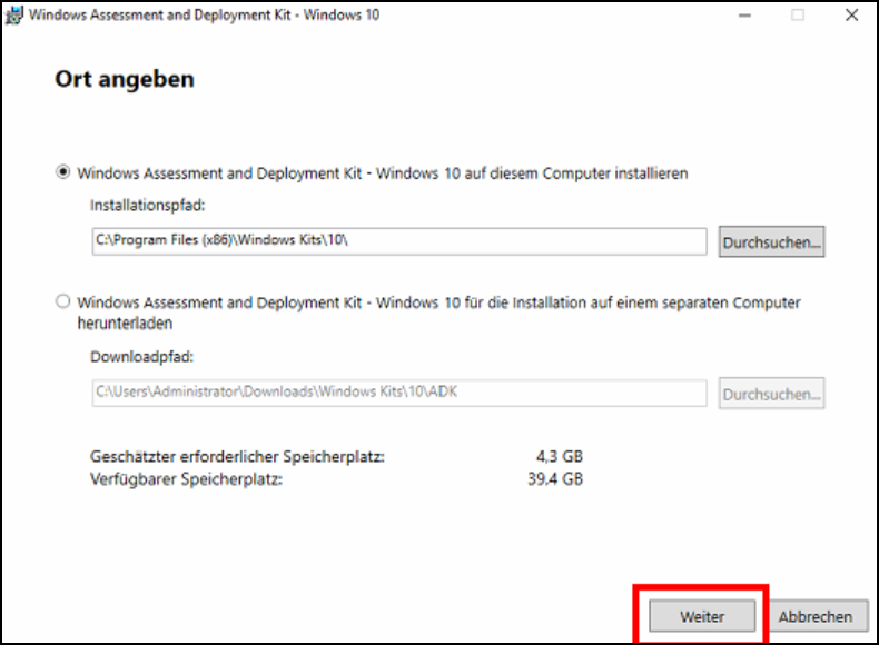 Führen Sie die heruntergeladene Datei „adksetup.exe“ aus. Wählen Sie folgende Option und passen Sie evtl. den Installationspfad an: